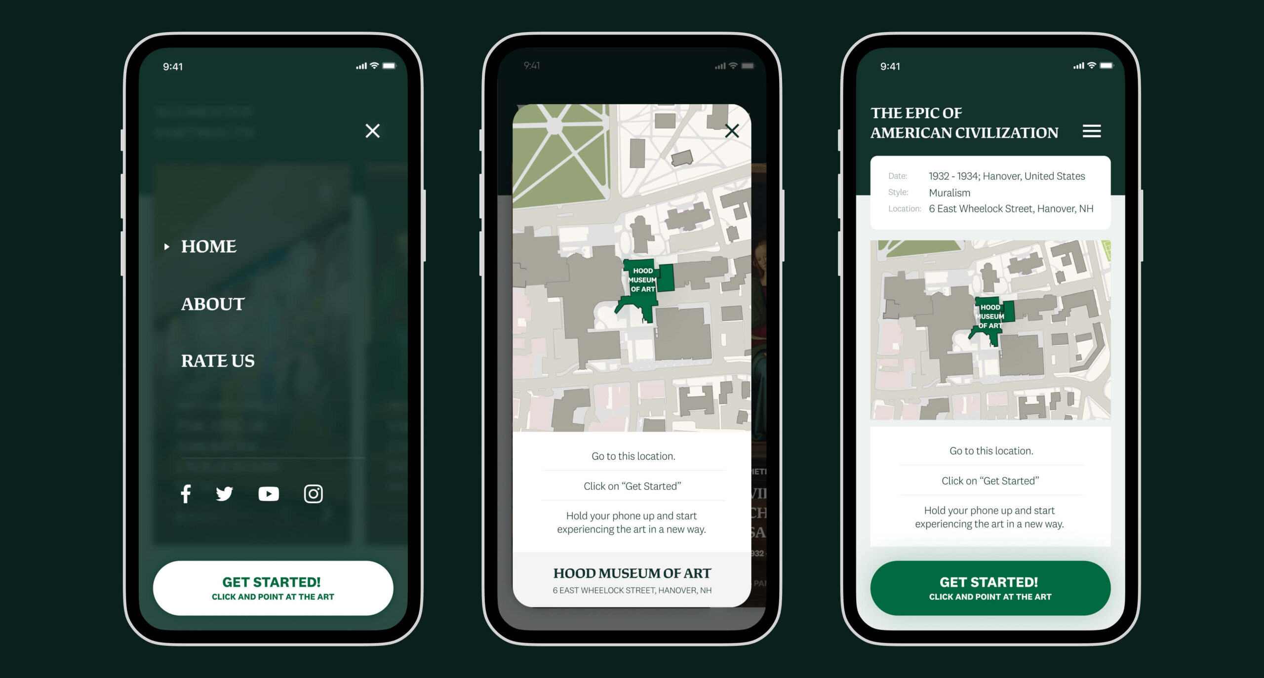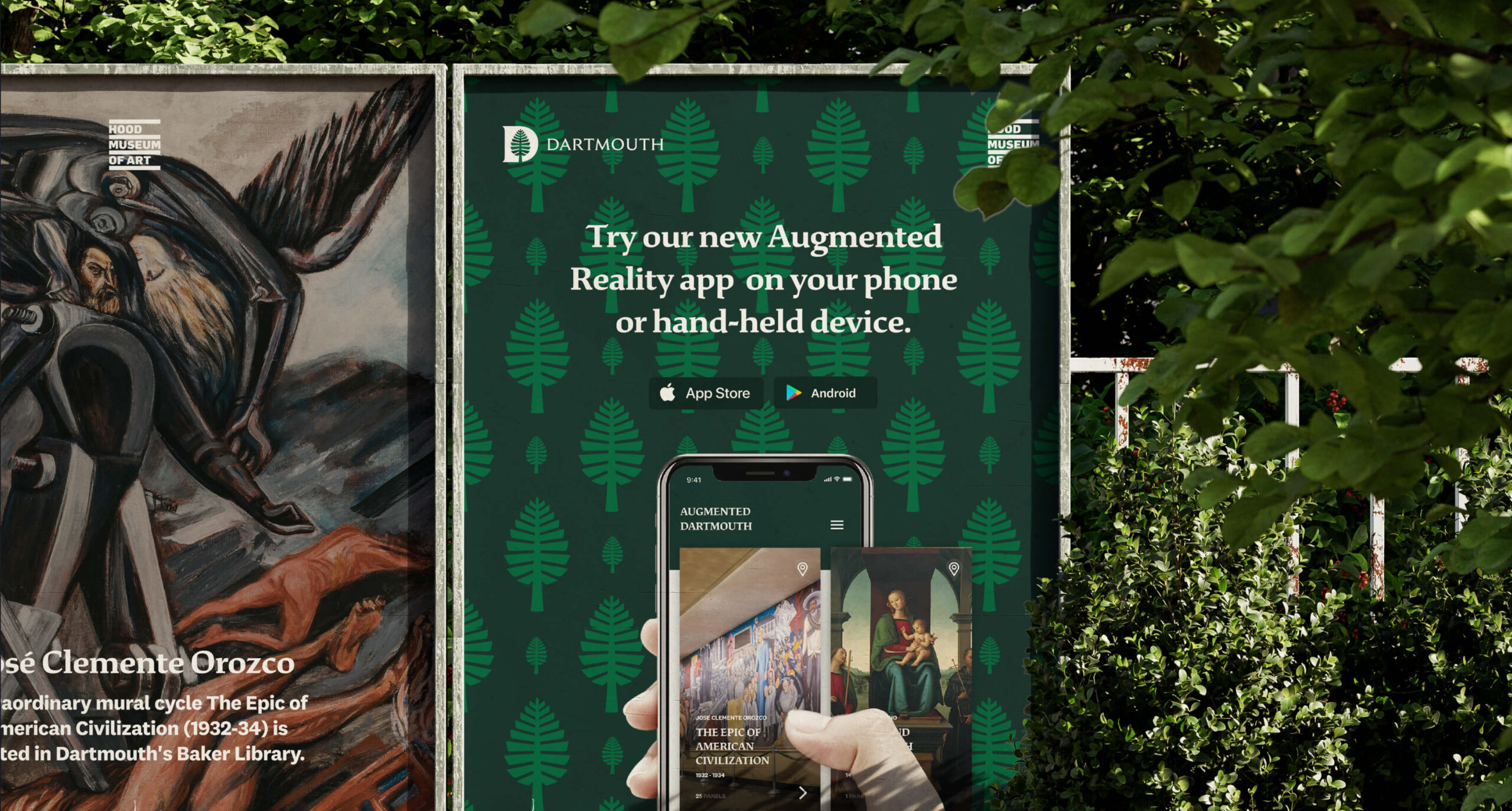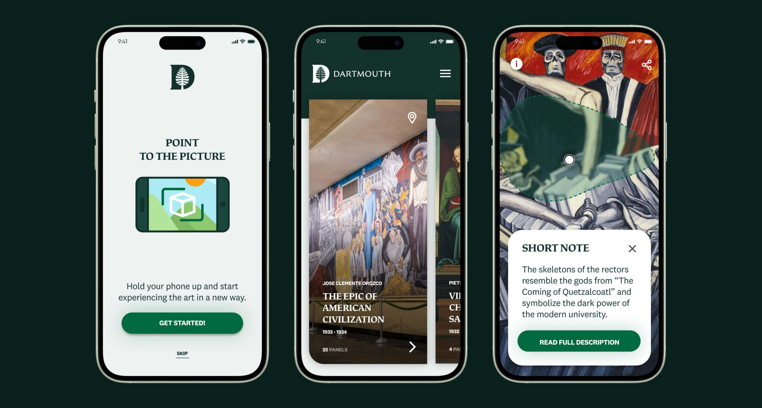 I worked on the branding and UX/UI design for the Augmendo App, an augmented reality tool that enhances the viewing experience of two key pieces of art at the college. I designed over 100 screens for the app, overall visual identity that aligned with Dartmouth’s brand. The app was a success, and there are plans to expand it to other artworks on campus and make it available to other museums.