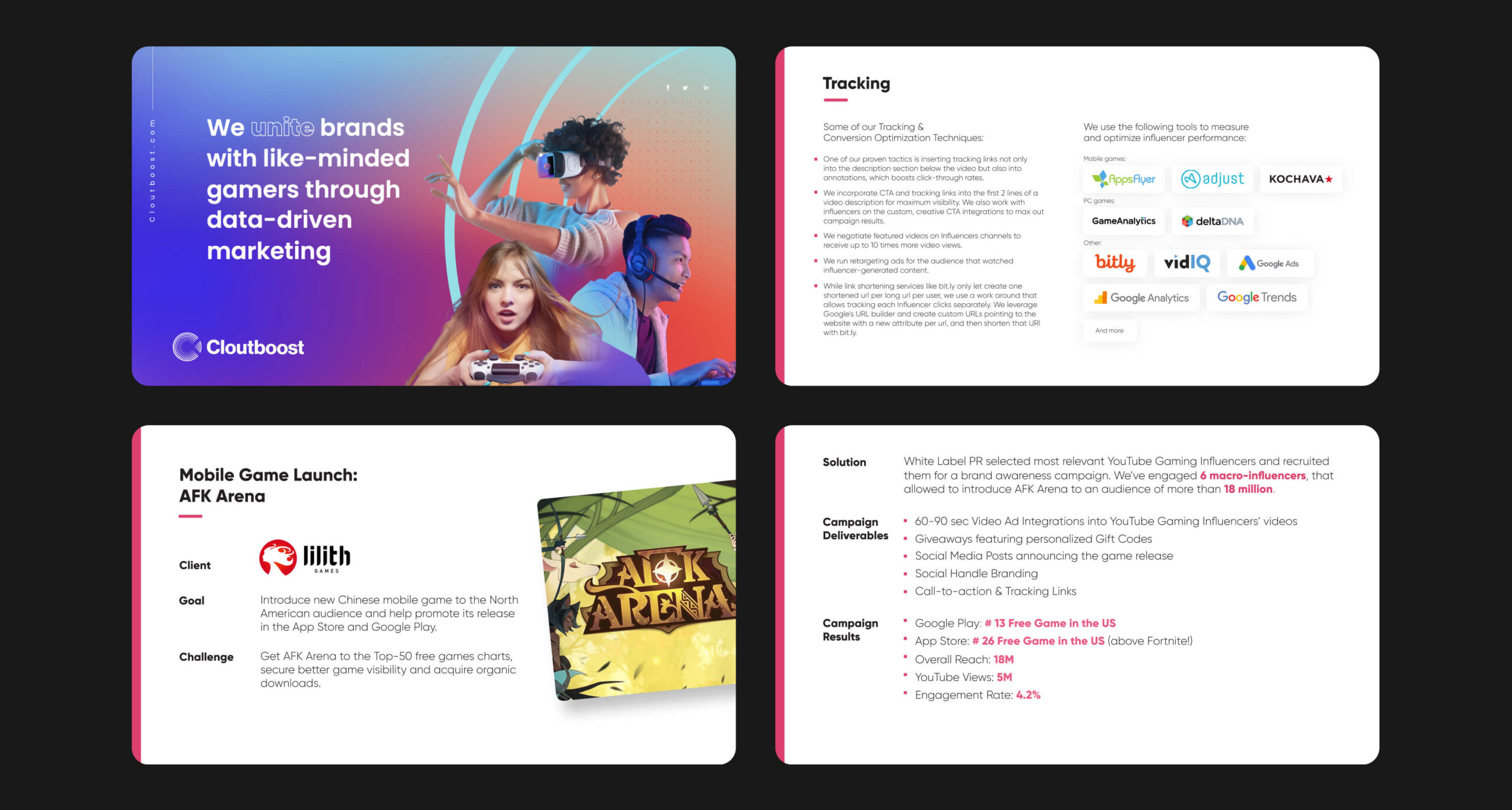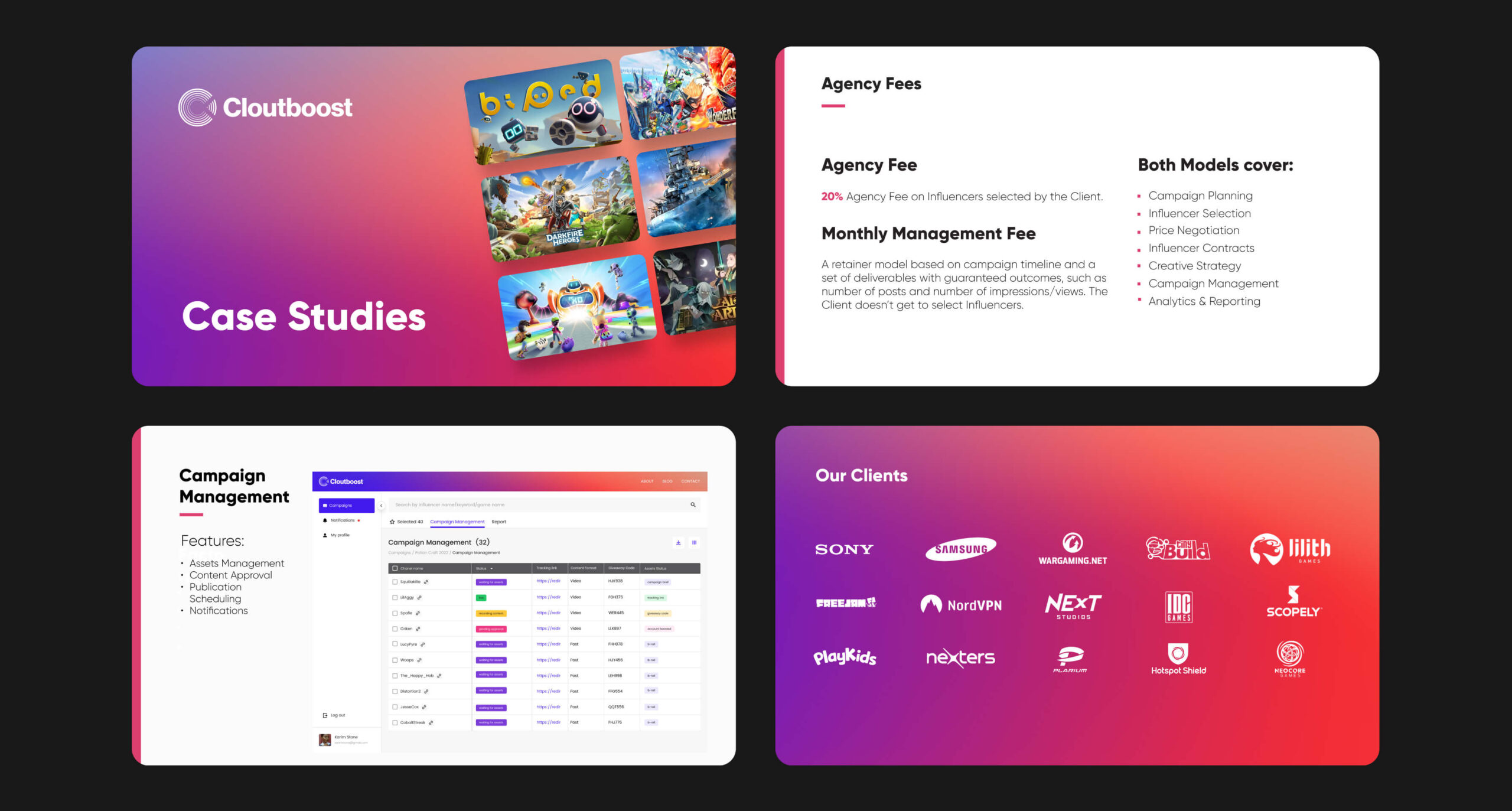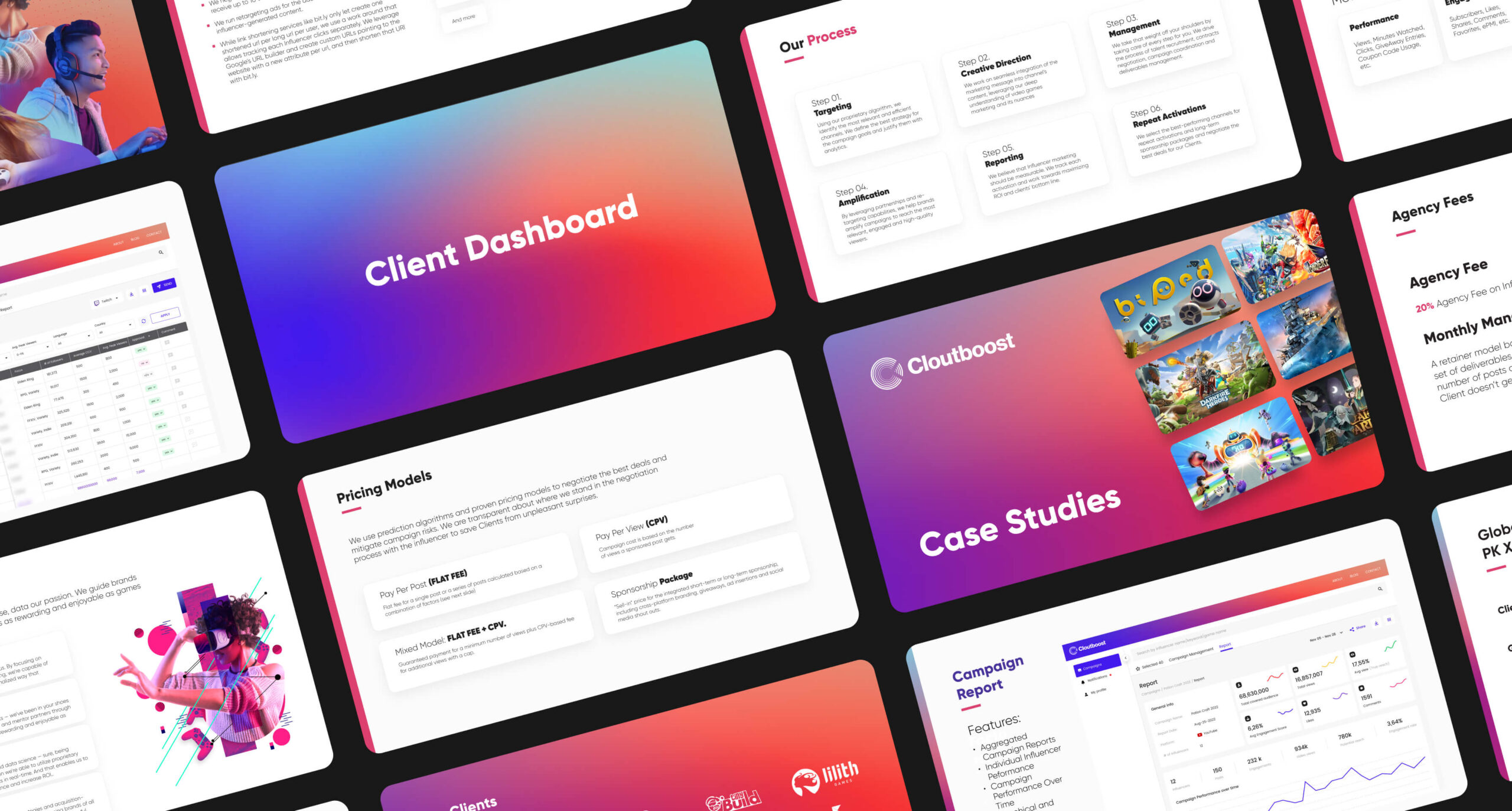 I designed both static and animated pitch decks and presentations using Canva and Webflow. These decks highlighted CloutBoost’s influencer marketing strategies and campaign results, with sections on goals, challenges, solutions, and outcomes.