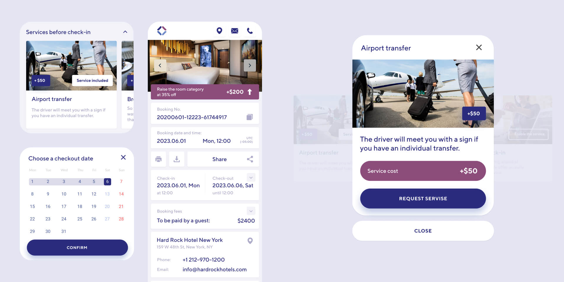 For the mobile application it was necessary to develop ux-prototyping and ui-design in two versions of the personal account: one for booking management before check-in, the other – for interaction with the hotel during the stay, ensuring the unity of style and functionality.